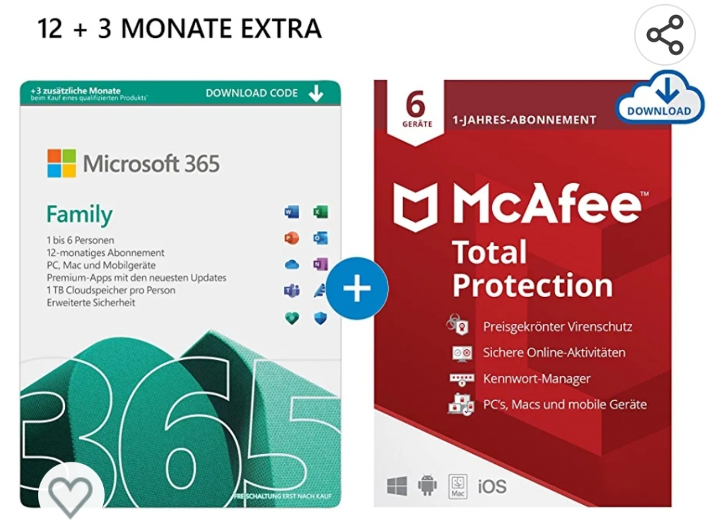 Microsoft 365 Family 12+3 months subscription | 6 users | Multiple PCs/Macs, Tablets/mobile devices | Download Code + McAfee Total Protection 2022 | 6 devices |12 months subscription | Download Code