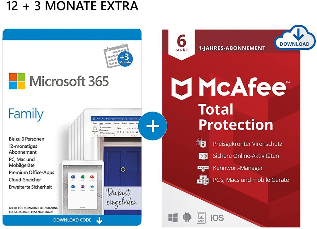 Entscheidend ist das Paket „Microsoft 365 Family 12+3 Monate | 6 Nutzer“. Da bekommt ihr nämlich Microsoft 365 mit einer Lizenz für 12 + 3 Monate. Im Paket ist sogar noch die Norton oder der McAfee Total Protection 2020 zu finden, aber das könnt ihr ja einfach verschenken.
