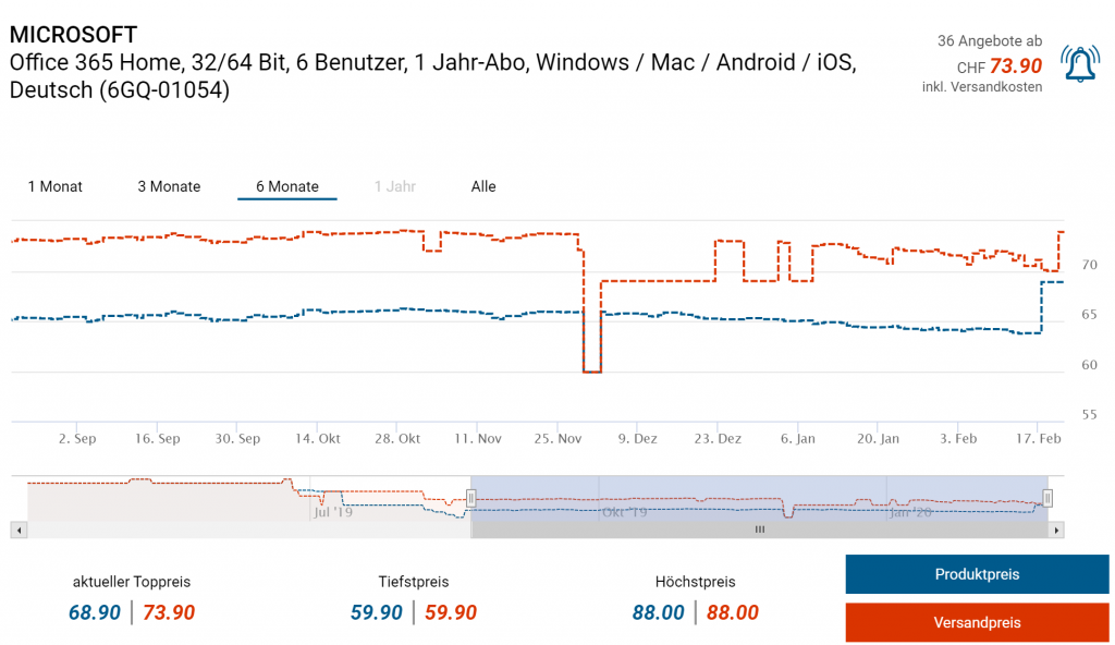 Bei Amazon.de gibt’s gerade Office 365 Home für bis zu 6 Nutzer (Jahresabo) für umgerechnet CHF 47.05 inklusive Verzollung und Versand in die Schweiz. In der Schweiz kostet Office 365 Home ab CHF 73.90 Bestpreis war bei CHF 59.90