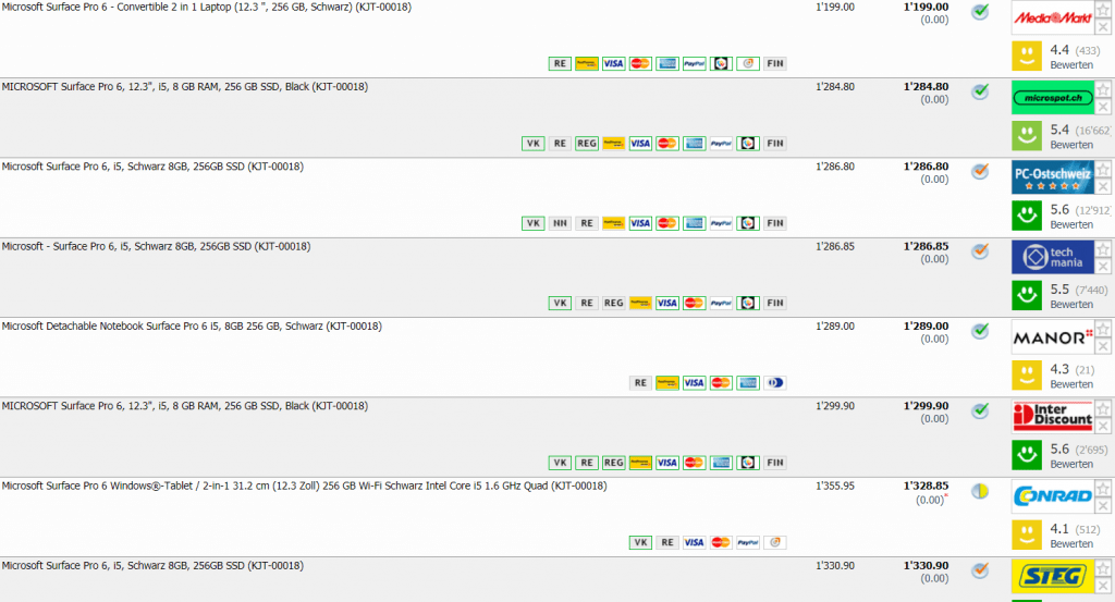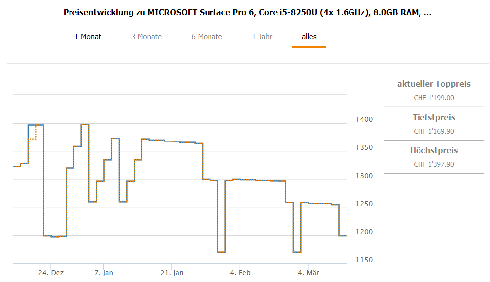 Bisheriger Bestpreis laut toppreise für diese Version ohne das Typecover war bei CHF 1’169.90 Zweitbester Preis im Moment (ohne das Typecover) ist bei CHF 1’284.80 Das Typecover findet man ab ca. 100 Franken, wenn man einen guten Deal hat.