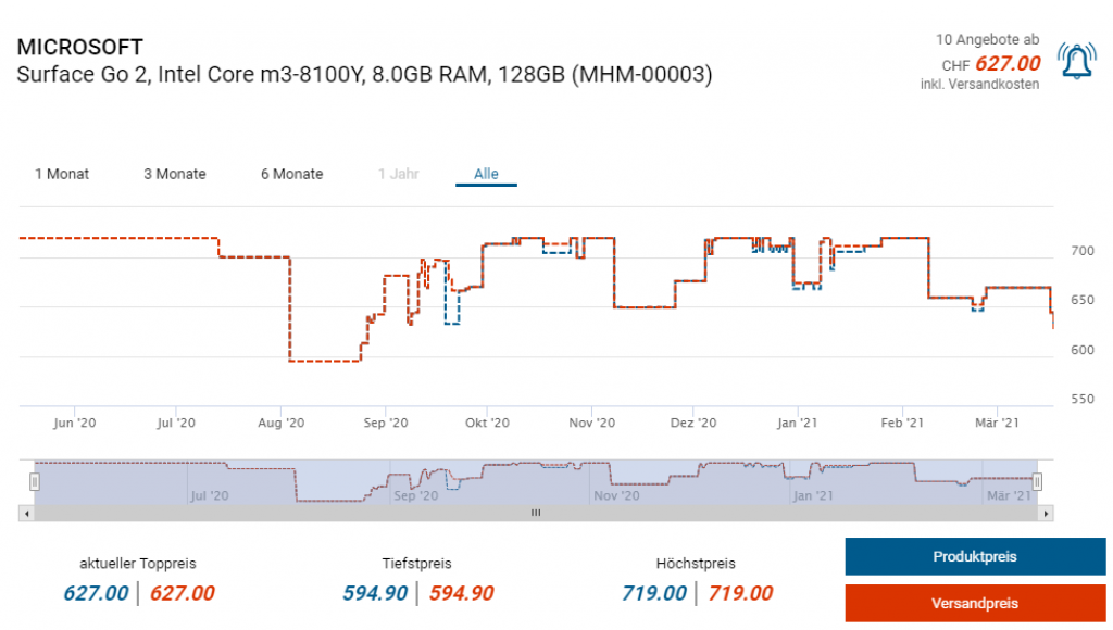 Bei Amazon gibts derzeit den “Tablet”-Laptop Microsoft Surface Go 2 zum Aktionspreis von knapp 549 Franken. Laut toppreise soll der Vergleichspreis bei 627 Franken. Wenn man dem Preisgraphen Glauben schenken darf solls auch ein neuer Bestpreis sein.