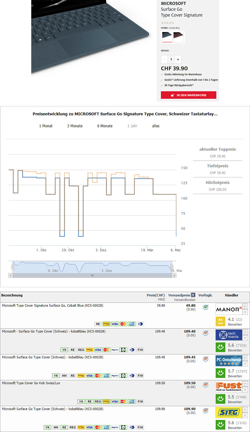 Bei Manor gibt es momentan das Microsoft Surface Go Signature Type Cover (Cobalt Blue) zum Bestpreis von CHF 39.90. Es empfiehlt sich, die Bestellung in einem Manor vor Ort abzuholen da ansonsten noch zusätzliche Portokosten anfallen.