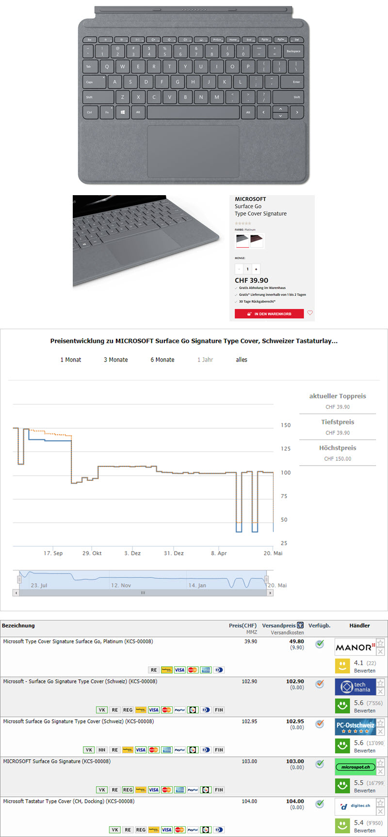 Bei Manor gibt es momentan wenige Exemplare des Microsoft Surface Go Signature Type Cover (Platinum) zum Bestpreis von CHF 39.90. Es empfiehlt sich, die Bestellung in einem Manor vor Ort abzuholen da ansonsten noch zusätzliche Portokosten anfallen.