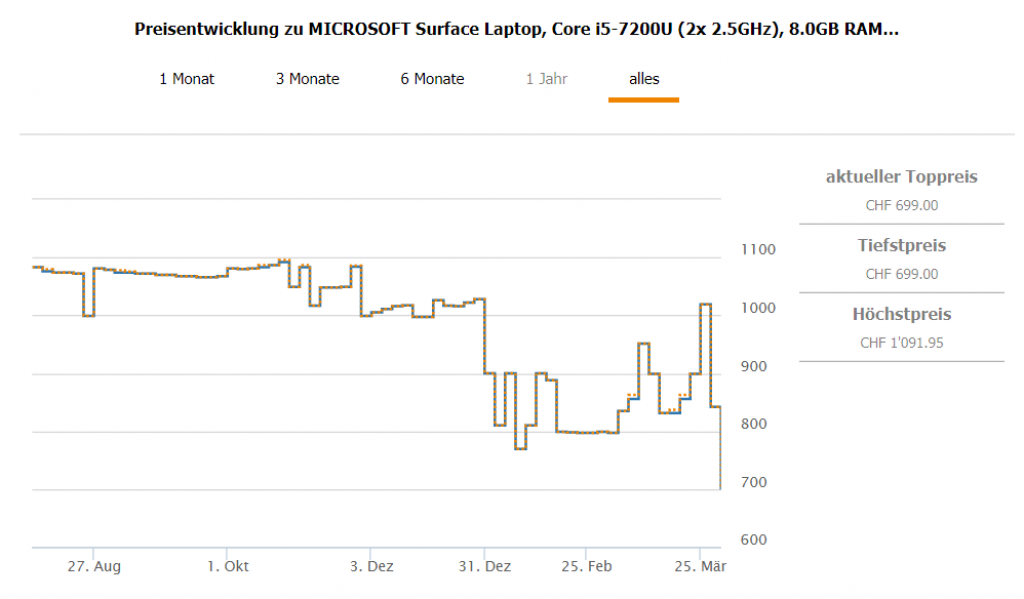 Im offiziellen Microsoft Store gibt’s gerade das Microsoft Surface Laptop der 1. Generation mit i5 Prozessor, 128GB SSD Speicherplatz und 8GB RAM für CHF 699.- Zweitbester Preis in der Schweiz liegt bei CHF 841.90, bisheriger Bestpreis war bei CHF 769.-