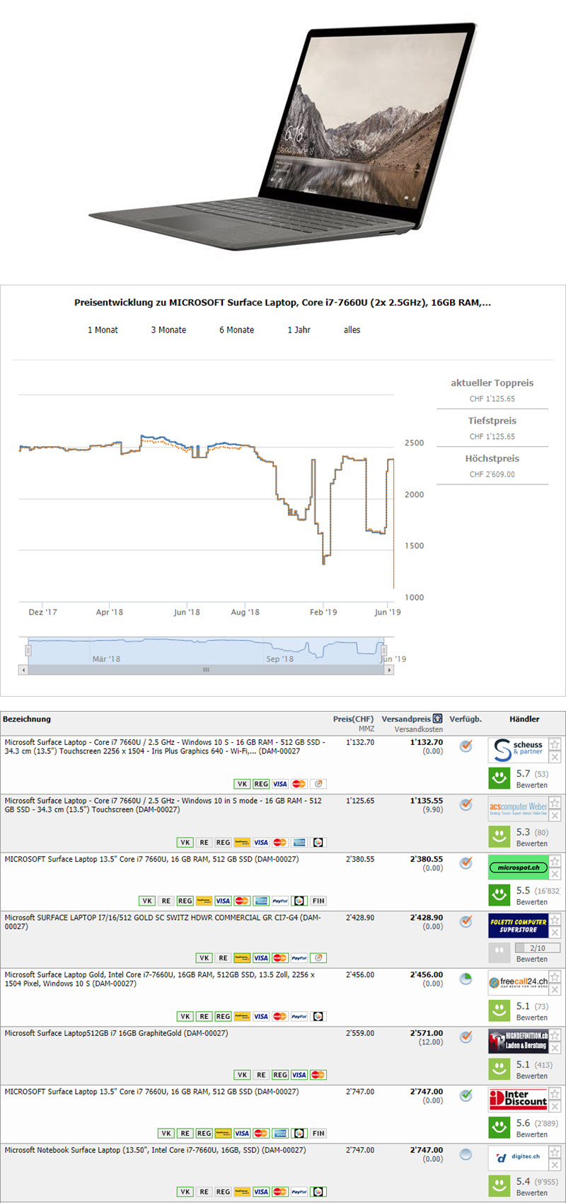 Bei Scheuss & Partner gibt es momentan das Microsoft Surface Laptop (13.50″, Intel Core i7-7660U, 16GB RAM, 512GB SSD) in gold zum Bestpreis von CHF 1132.70.