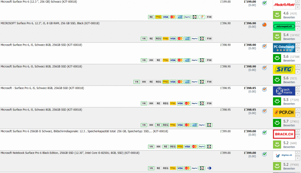 Bei MediaMarkt gibt’s das neue Microsoft Surface Pro 6 mit 256GB SSD Speicher, i5 Prozessor und 8GB RAM für CHF 1’199.- Cool auch, weil es die schwarze Version ist, mit der man sich momentan ein wenig von den anderen Surface Besitzern abhebt.