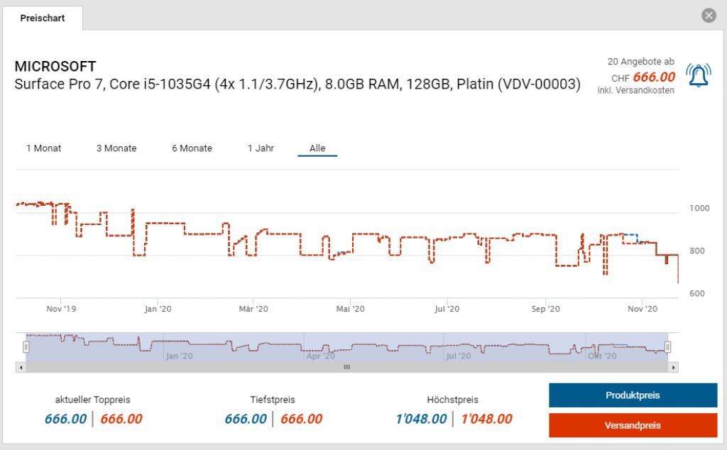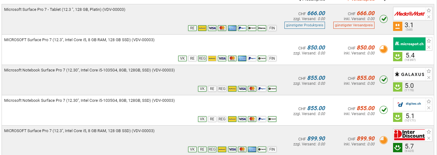 Bei Media Markt gibt es das MICROSOFT Surface Pro 7 zum neuen Bestpreis von CHF 666.-. Der vorherige Bestpreis war CHF 710.50. Der zweitbeste Preis beträgt CHF 850.-.