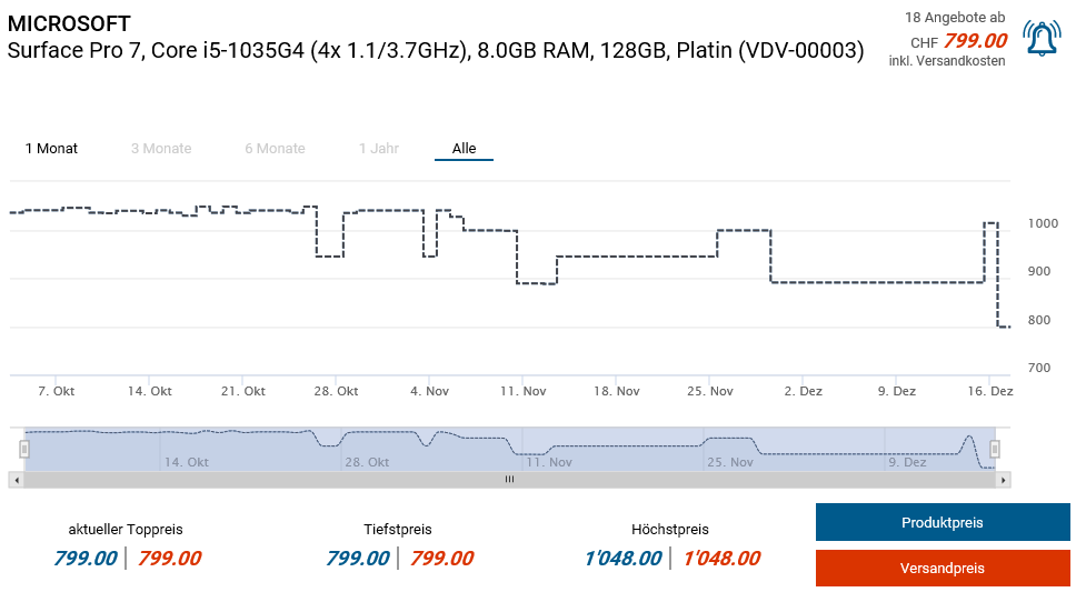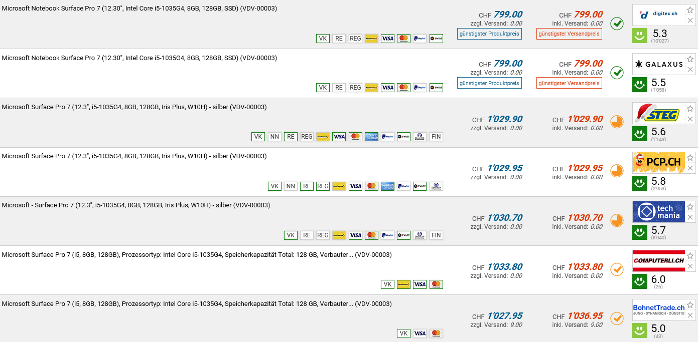 Bei digitec gibt es aktuell das MICROSOFT Surface Pro 7, i5-1035G4, 8.0GB RAM, 128GB SSD für 799.- CHF. Zweitbester Preis gemäss toppreise sind 1029.90 CHF.