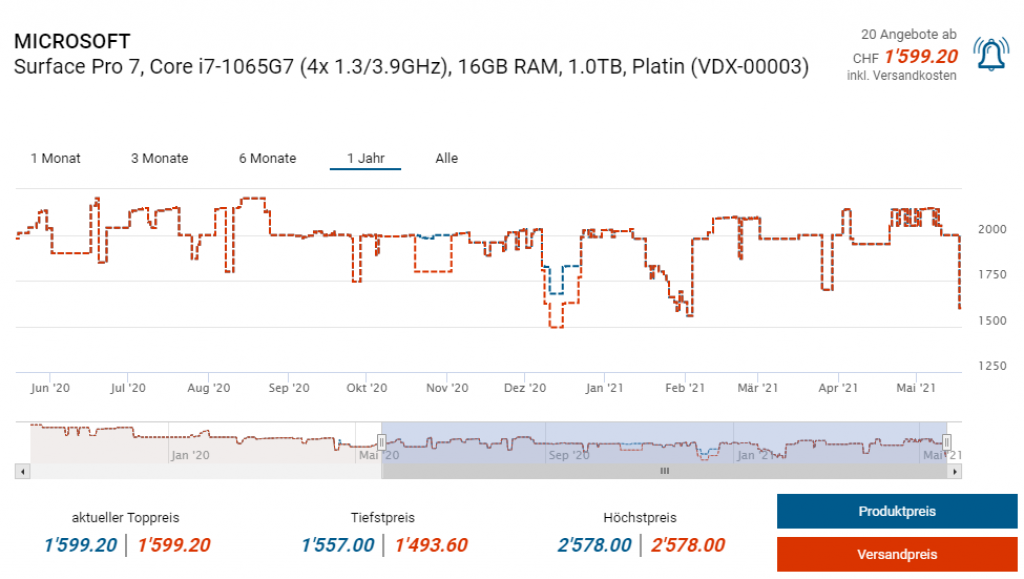 Bei Mediamarkt gibts derzeit das Convertible Microsoft Surface Pro 7 zum Aktionspreis von CHF 1599.20. Es handelt sich bei diesem Angebot um das Modell mit i7-Prozessor, 16GB RAM und 1TB SSD. Beim Vergleichsangebot gibts zwar das Type Cover gratis dazu, allerdings ist der Preis auch viel höher.