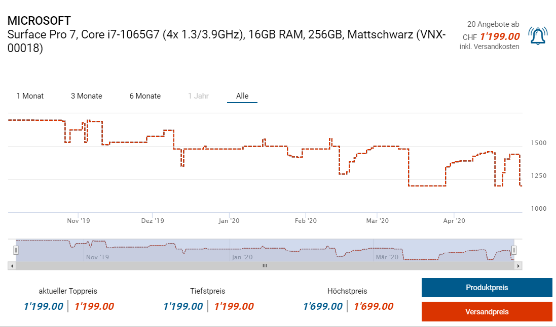 Anbei noch der Preisgraph, der das Type Cover NICHT miteinbezieht. Es handelt sich hier also um neue Bestpreise.