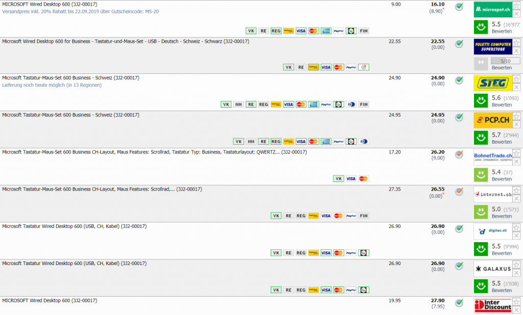 Bei microspot gibt’s gerade die Microsoft Tastatur und Maus Wired Desktop 600 für 7.20 Franken (bei Abholung) wenn man den Gutscheincode MS-20 einsetzt. Wenn man eine günstige Maus/Tastaturkombi möchte, kann man hier bedenkenlos zuschlagen.