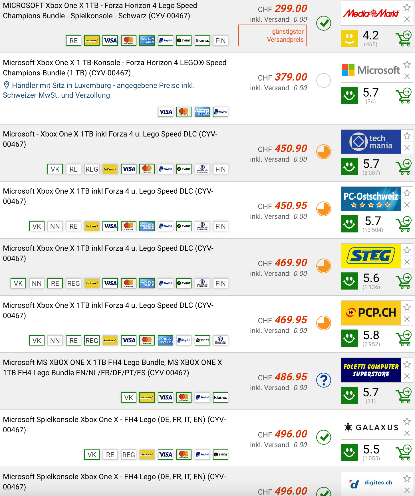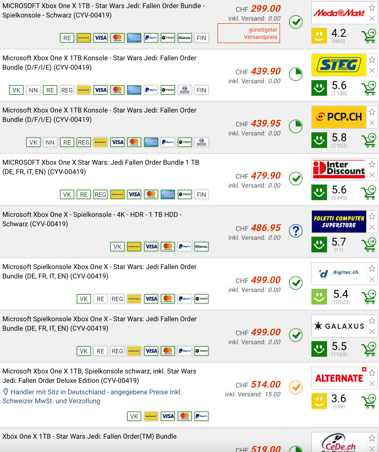 Falls jemand in der BlackFriday Woche die Gelegenheit verpasst hat, bei MediaMarkt gibt es aktuell das MICROSOFT Xbox One X, 1.0TB, Star Wars Jedi: Fallen Order Bundle oder Forza Horizon 4 LEGO Speed Champions Bundle für je 299.- CHF.