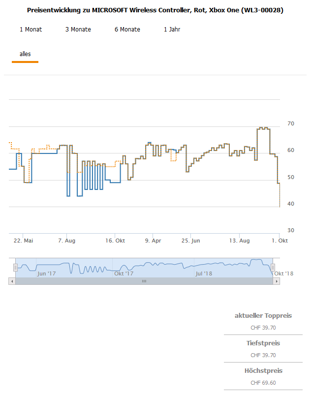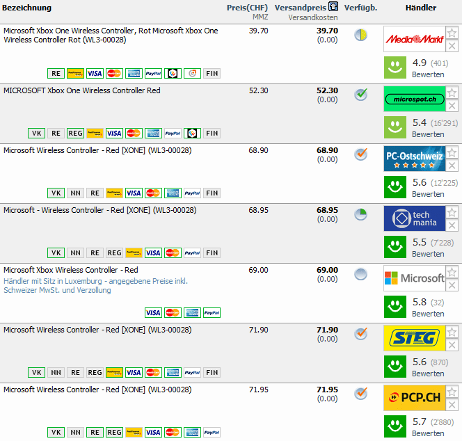 Bei MediaMarkt gibt es gerade den MICROSOFT XBOX Wireless Controller in Rot für 39.70 CHF. Üblicherweise Kosten die Controller immer über 50 CHF, daher eine gute Gelegenheit, entsprechend liegt der zweitbeste Preis aktuell bei 52.30 CHF.