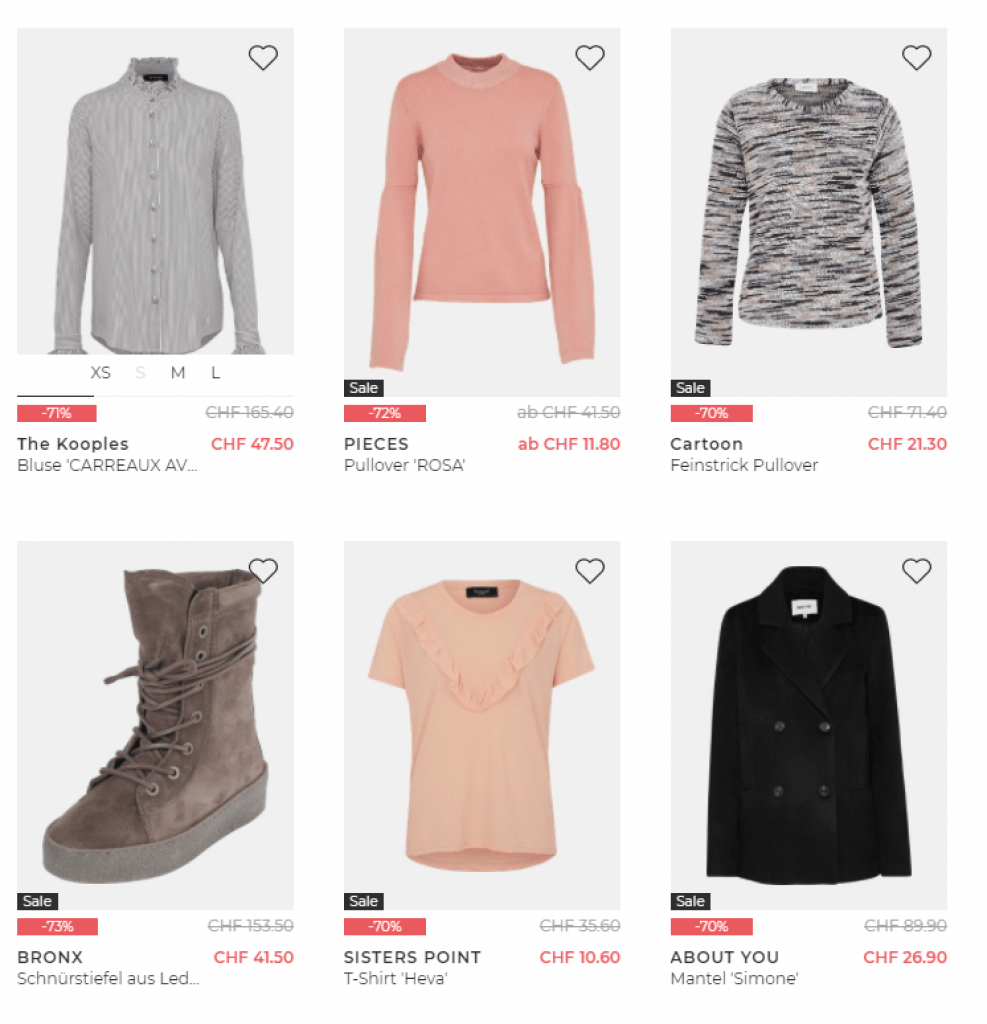 Stelle oben unbedingt die verschiedenen Filtermöglichkeiten ein - so kannst du beispielsweise nach Rabatt sortieren, oder nach deiner Grösse.