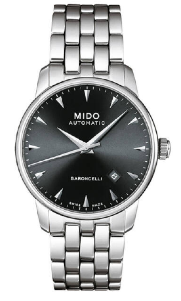 Die elegante Herrenuhr von Mido fasziniert mit Ihrem traumhaften Design und bietet einen ästhetischen Vorgeschmack der Kollektion «Baroncelli». Das Automatikuhrwerk tickt in einem Gehäuse aus feinstem Edelstahl und dominiert auf einem geschmackvollen Armband aus dem gleichen Material. Mit dem Falt-Verschluss sitzt der Swiss-Made-Zeitmesser stabil und bequem auf Ihrem Handgelenk. Auf einem runden Durchmesser von 38 mm und einer Höhe von 9.10 mm präsentiert sich das Zifferblatt in Schwarz. Deutlich lesbare Indizes, in silberner Nunace, verleihen der analogen Anzeige, zusammen mit der Datumsanzeige, einen sensationellen Mix aus Zweckdienlichkeit und Schönheit. Das schützende Saphirglas schenkt Ihnen ein Gefühl von Sicherheit.