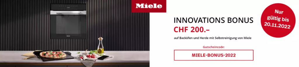Bei Nettoshop könnt auf Backöfen und Kochherde mit Selbstreinigungsfunktion von Miele CHF 200.- Innovationsbonus erhalten.