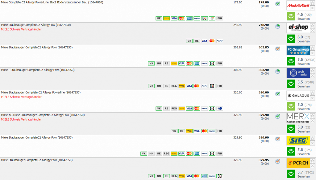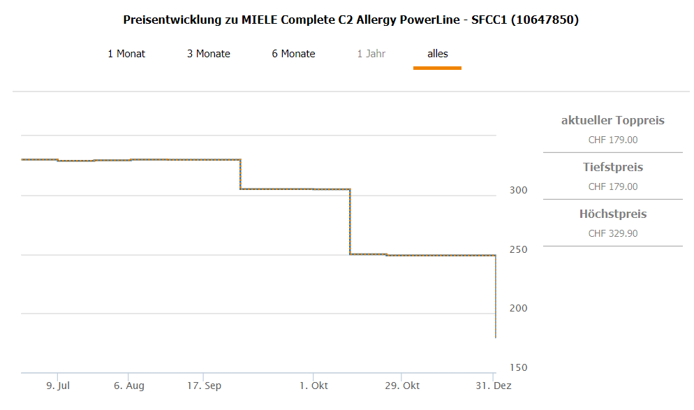 Ebenfalls im MediaMarkt Sale gibt’s den Allergie Staubsauger MIELE Complete C2 Allergy PowerLine - SFCC1 für CHF 179.- Bei anderen Händlern kostet der Staubsauger mindestens CHF 248.90 und bis zu über 300 Franken. Der zweitbeste Preis ist auch der bisherige Bestpreis.