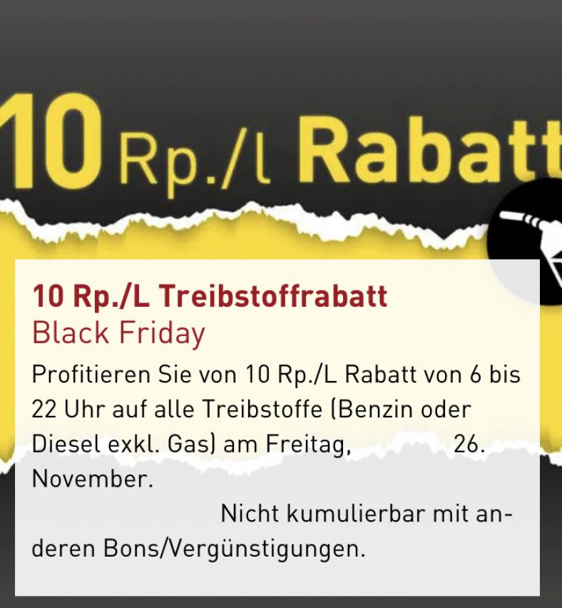 Profitieren Sie von 10 Rp./L Rabatt von 6 bis 22 Uhr auf alle Treibstoffe (Benzin oder Diesel exkl. Gas) am Freitag, 26. November. Nicht kumulierbar mit anderen Bons/Vergünstigungen.