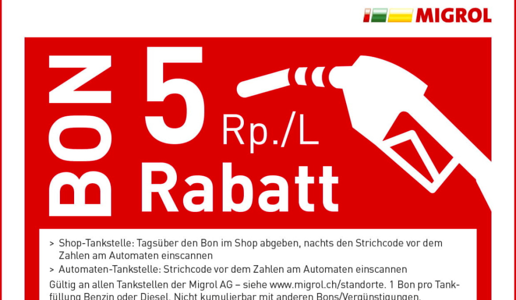 Bon für Migrol Rabatt 5 Rp / pro Liter, einlösbar pro Tankfüllung bis 21.01.2025.