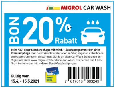 Den Bon kann an allen Migrol Car Wash Stationen bis am 15.5.2021 eingelöst werden.