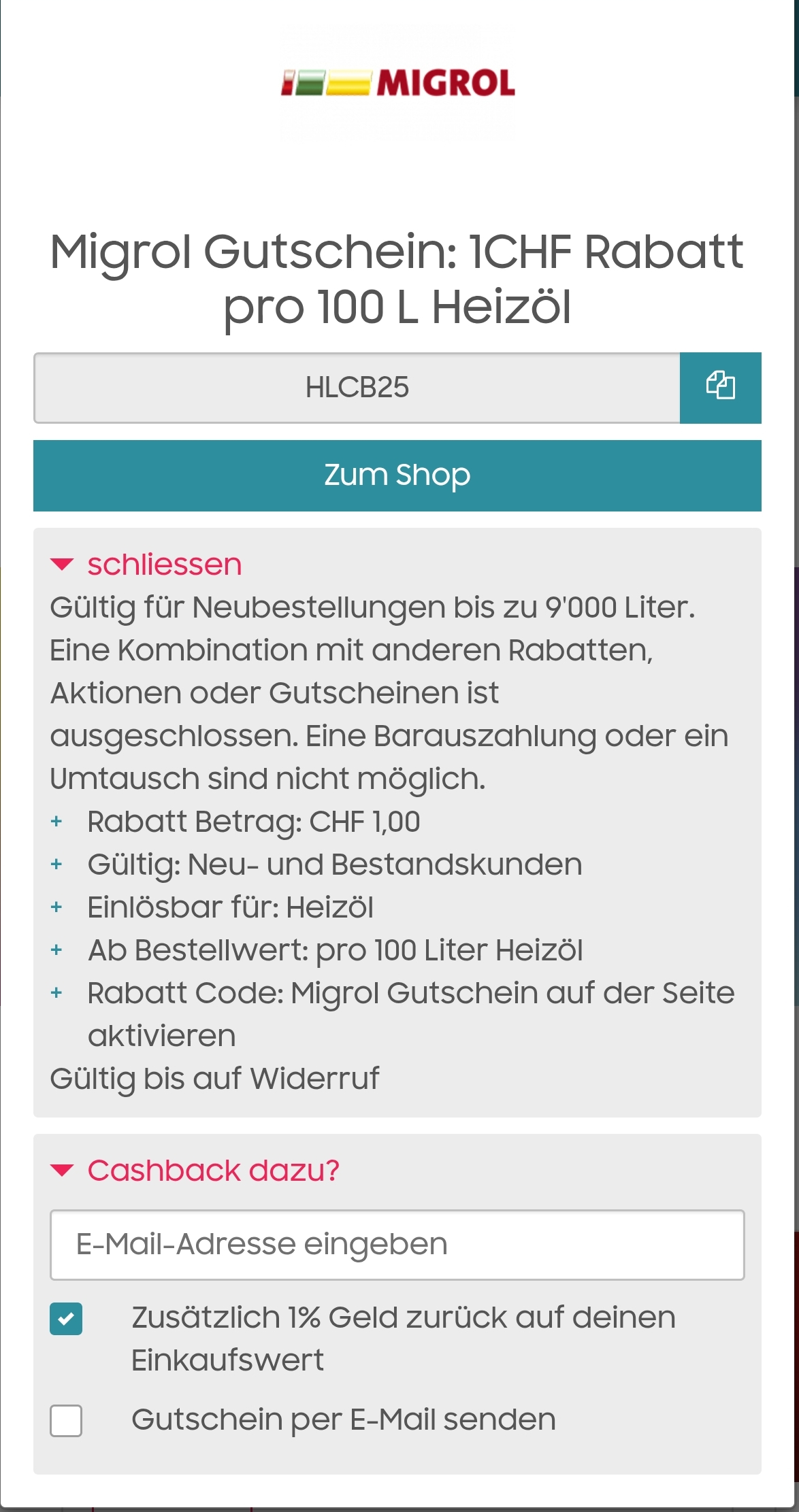 Ich bin zufällig auf rewardo.ch über einen Gutschein für eine Heizöl-Bestellung bei Migrol gestolpert.