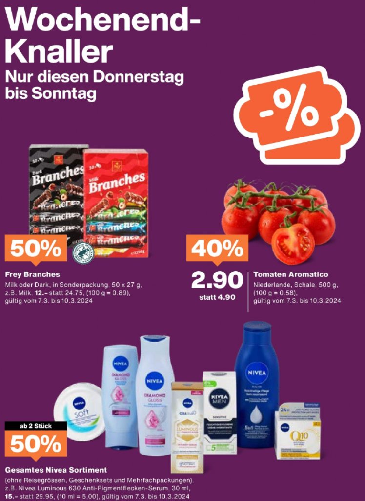 Aktuell gibt es bei der Migros die Wochendknaller Aktion mit zum Beispiel 50% auf das Nivea Sortiment ab 2 Stück, 50% auf Mil oder Dark Frey Brachnes (50x 27g = CHF 12.- statt CHF 24.75) und 40% Rabatt auf Tomaten Aromatico. (500g CHF 2.90 statt CHF 4.90)
