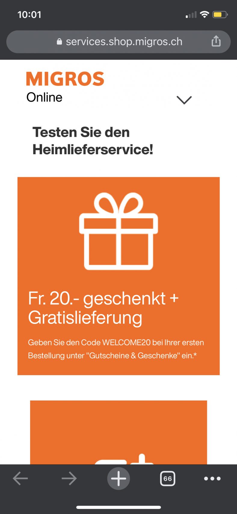 Bei einer Heimlieferung von Migros gibt es aktuell für Neukunden einen Rabatt von CHF 20.- und die Lieferung erfolgt gratis. Dieses Angebot gilt bis zum 31.12.2021 und ist für Neukunden gültig. Pro Haushalt einmal möglich.