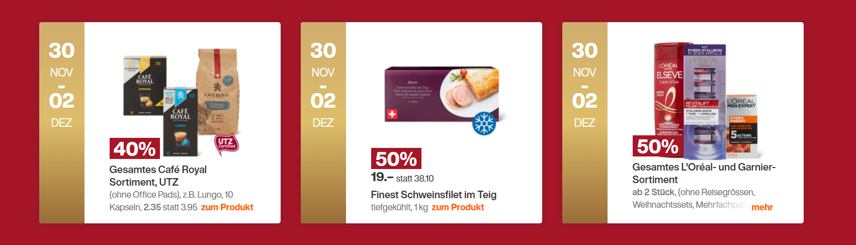 Update - 2020.11.30Ab heute bis zum 2.12. gibts 40% Rabatt aufs Café Royal Sortiment, das Finest Schweinsfilet im Teig (TK) für CHF 19.- sowie 50% Rabatt aufs ganze L’Oréal und Garnier-Sortiment (ab 2 Stück)