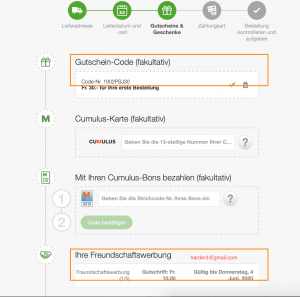 Die obige Freundschaftswerbung-Emaildresse für die Freundschaftswerbung muss bei der Bestellung im Schritt „Gutscheine & Geschenke“ unter „Wurden Sie von einem Freund geworben?“ eingegeben und bestätigt werden.