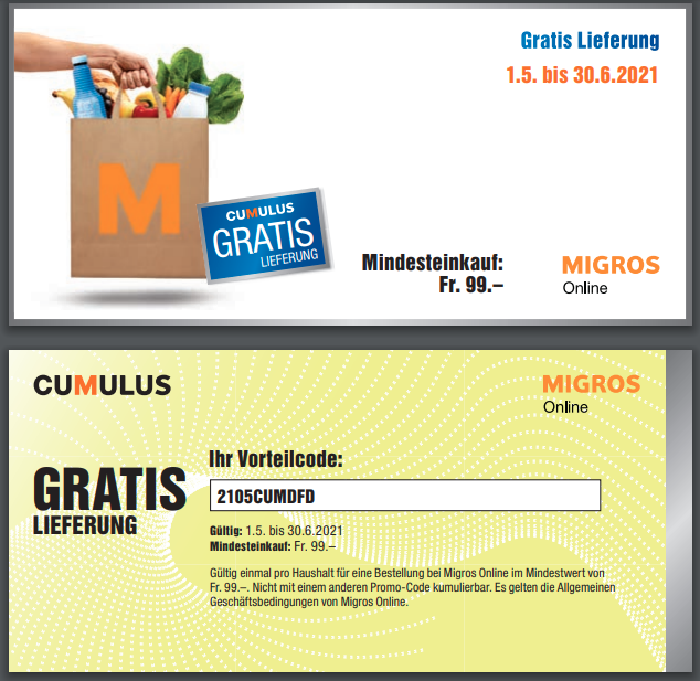 Migros Online Gratis Lieferung Gültig einmal pro Haushalt für eine Bestellung bei Migros Online im Mindestwert von Fr. 99.–. Nicht mit einem anderen Promo-Code kumulierbar. Es gelten die Allgemeinen Geschäftsbedingungen von Migros Online.