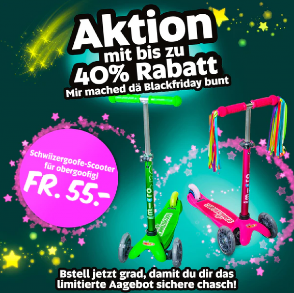 Erfüll auch du dir den Traum vom coolsten Micro-Scooter des ganzen Schwiizergoofe-Universums und hol dir das unglaublich günstige Black Friday Angebot ab sofort – solange Vorrat reicht!