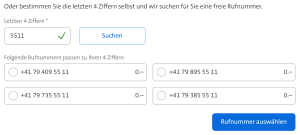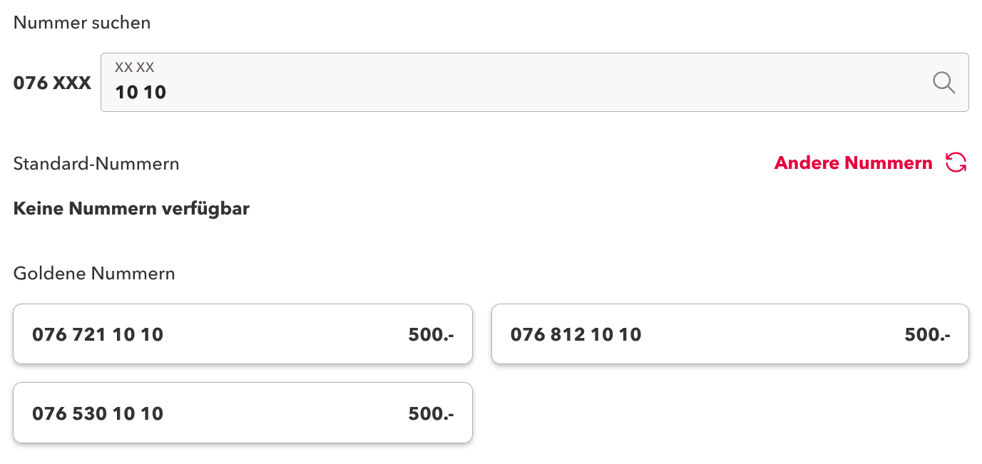 Mir war nicht bewusst, dass man bei Swisscom die letzten 4 Ziffern der Nummer selbst wählen kann aus den verfügbaren Nummern. Ich wollte schon auf den Online-Privat-Verkaufsplattformen nach „schönen“ Nummern suchen, aber dort zahlt man schnell ein paar Hundert Franken und hat weniger Auswahl.
