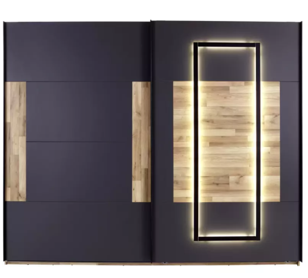 Entdecken Sie den modern gestalteten Schwebetürenschrank James, der mit seinen 2 Türen eine stilvolle zweifarbige Front in zeitlosem Graphit und warmem Eichefarben präsentiert. Die integrierte LED-Beleuchtung schafft eine einladende Atmosphäre und betont die hochwertige Optik des Schranks. Dieser Schrank überzeugt nicht nur optisch, sondern auch funktional: Die leise gleitenden Schwebetüren und die platzsparende Konstruktion sind perfekt für Räume mit begrenztem Platzangebot. Die eleganten Metallgriffleisten in Schwarz bieten Komfort beim Öffnen und Schliessen der Türen. Mit Abmessungen von 270 x 225,5 x 60 cm bietet der Schrank grosszügigen Stauraum. Die Innenaufteilung beinhaltet 3 Kleiderstangen und 3 robuste Einlegeböden, die jeweils bis zu 5 kg tragen können. Die 22 mm starken Böden gewährleisten höchste Stabilität. Dank der Eichendekor-Oberfläche steht der Schrank für deutsche Qualität und Nachhaltigkeit, was durch das Blaue Engel und BQ-Zertifikat bestätigt wird. Die Pflege dieses Holzwerkstoff-Schranks ist unkompliziert und erfordert lediglich trockenes Abwischen. Entscheiden Sie sich für den Schwebetürenschrank „James“, um Ihrem Schlafzimmer eine zeitgemässe und funktionale Ergänzung zu verleihen. Bitte beachten Sie, dass Dekoration und Zubehör wie Türdämpfer und Passepartout nicht im Lieferumfang inbegriffen sind.