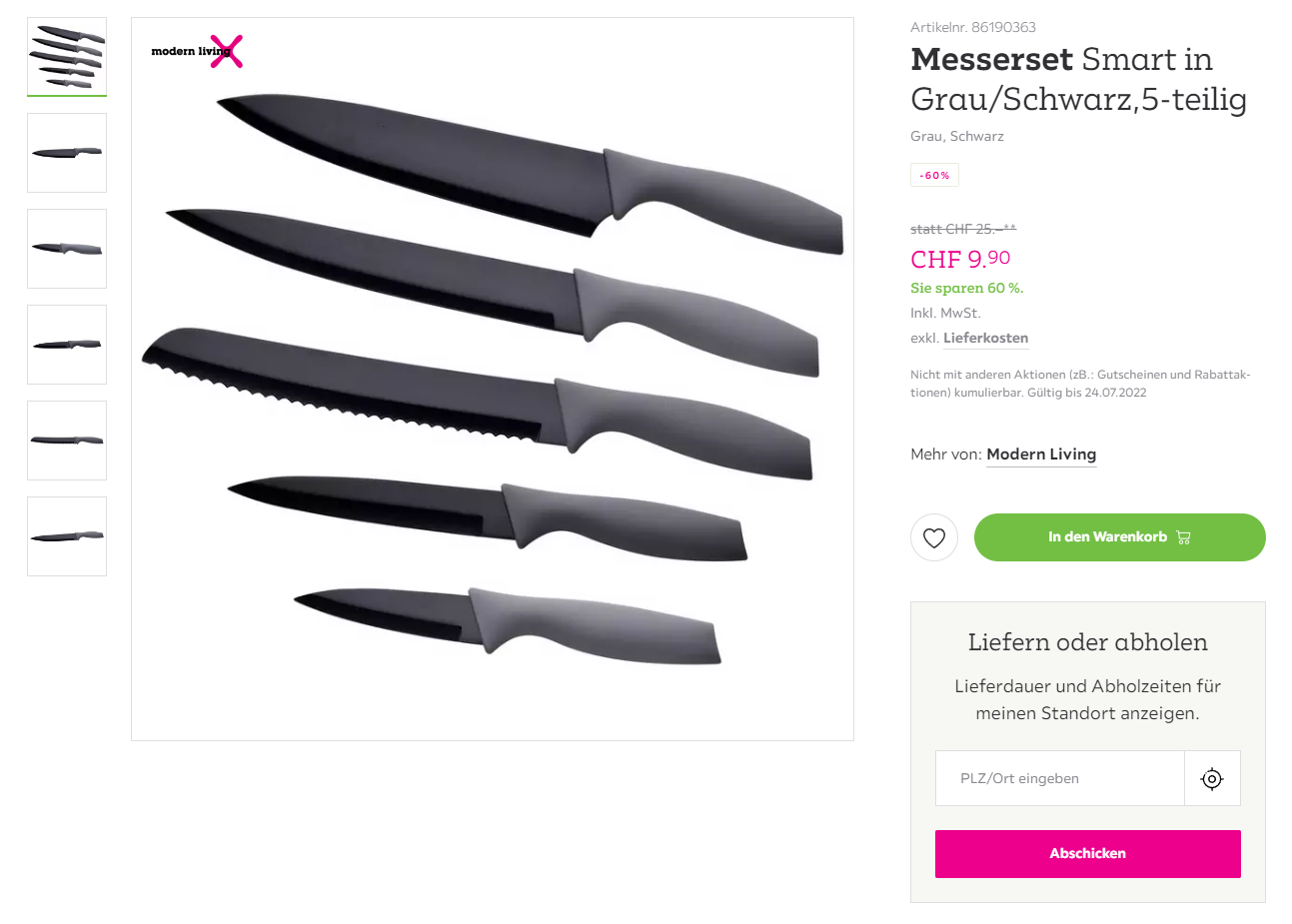 Das 5-teilige Messerset „Smart“ aus Edelstahl, bestehend aus Tranchiermesser, Universalmesser, Chefmesser, Brotmesser und Schälmesser gibt’s zum günstigen Preis von 9.90 Franken!
