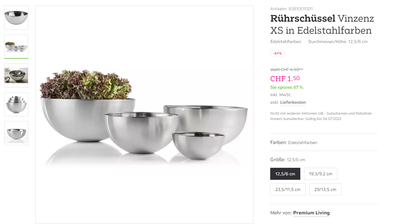 Auch günstig erhältlich sind die Edelstahl-Rührschüssel. Diese gibt’s zu Preisen zwischen 1.50 Franken bis 6.90 Franken mit Durchmessern 6 - 13.5cm: