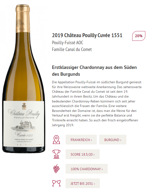 2019 Château Pouilly Cuvée 1551 - französischer Chardonnay für CHF 29.90 anstatt CHF 35.- pro Flasche