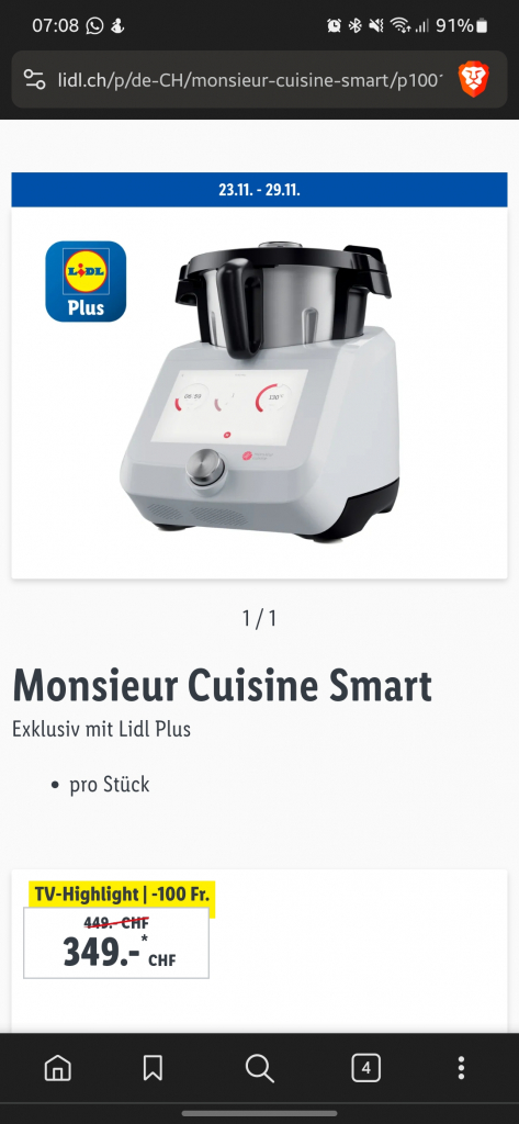Bei Lidl gibt es aktuell den Monsieur Cuisine Smart für 349 CHF mit Lidl Plus. Dieses Angebot bietet eine erschwingliche Möglichkeit, in die Welt der intelligenten Küchenmaschinen einzusteigen. Der Monsieur Cuisine Smart ist bekannt für seine vielseitigen Funktionen und die Unterstützung bei der Zubereitung verschiedenster Gerichte. Ein Angebot, das Kochbegeisterte nicht verpassen sollten!