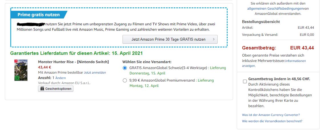 - Für Lieferungen in die Schweiz wird der Preis erst bei Angabe einer Schweizer Lieferadresse richtig angezeigt (Abzug der Mehrwertsteuer, zuzüglich Versandkosten) resp. beim Checkout an der Kasse (Amazon Frankreich, Italien, Spanien und Grossbritannien). Wir verwenden grundsätzlich den Interbanken-Kurs für die Umrechnung in CHF.