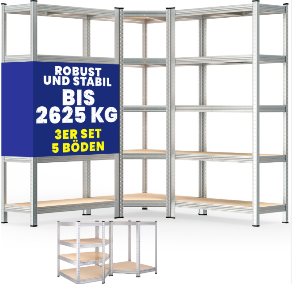 Bringen Sie Ordnung in Ihre Garage, Werkstatt, Lagerraum oder Keller! Dieses Regal-Set der Marke MONZANA® nutzt Ecken optimal aus und bietet reichlich Abstellfläche für Werkzeug, Fahrradersatzteile, Vorräte oder Garten- und Grillzubehör. Das Lagerregal besteht aus hochwertig verzinktem Stahl mit stabilen Streben und einer hohen Tragkraft von 875 kg pro Regal. Die 5mm dicken MDF Böden sind variabel montierbar und ermöglichen eine individuelle Anpassung der Regalhöhe. Gummischoner an den Standbeinen schützen den Boden vor Kratzern, und das Stecksystem erlaubt einen schnellen Aufbau ohne Schrauben. Ideal für Keller, Garage, Werkstatt, Lager oder Schuppen.