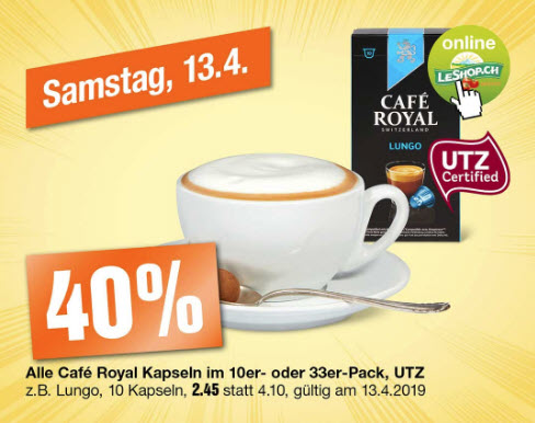 Im Rahmen der Osteraktionen gibt es heute (13.4.2019) 40% Rabatt auf alle Café Royal Kapseln bei Migros und LeShop. Bei LeShop kann die Aktion auch mit dem CHF 20.- Neukunden Gutscheincode WELCOME20 kombiniert werden (beachtet hier den Mindesteinkaufswert und die für die Lieferung zusätzlich anfallenden Kosten).