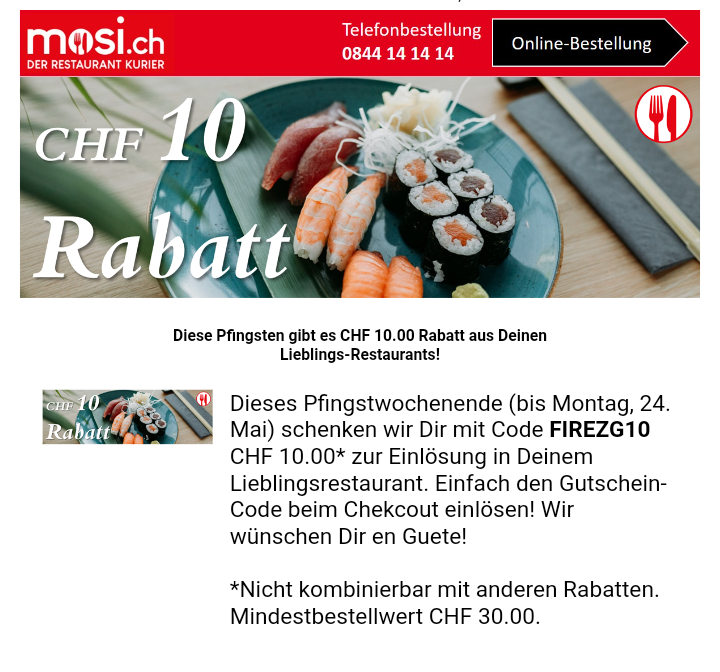 Bei Mosi gibt es über Pfingsten 10.- Rabatt bei einer Mindestbestellmenge ab 30.- mit Code FIREZG10