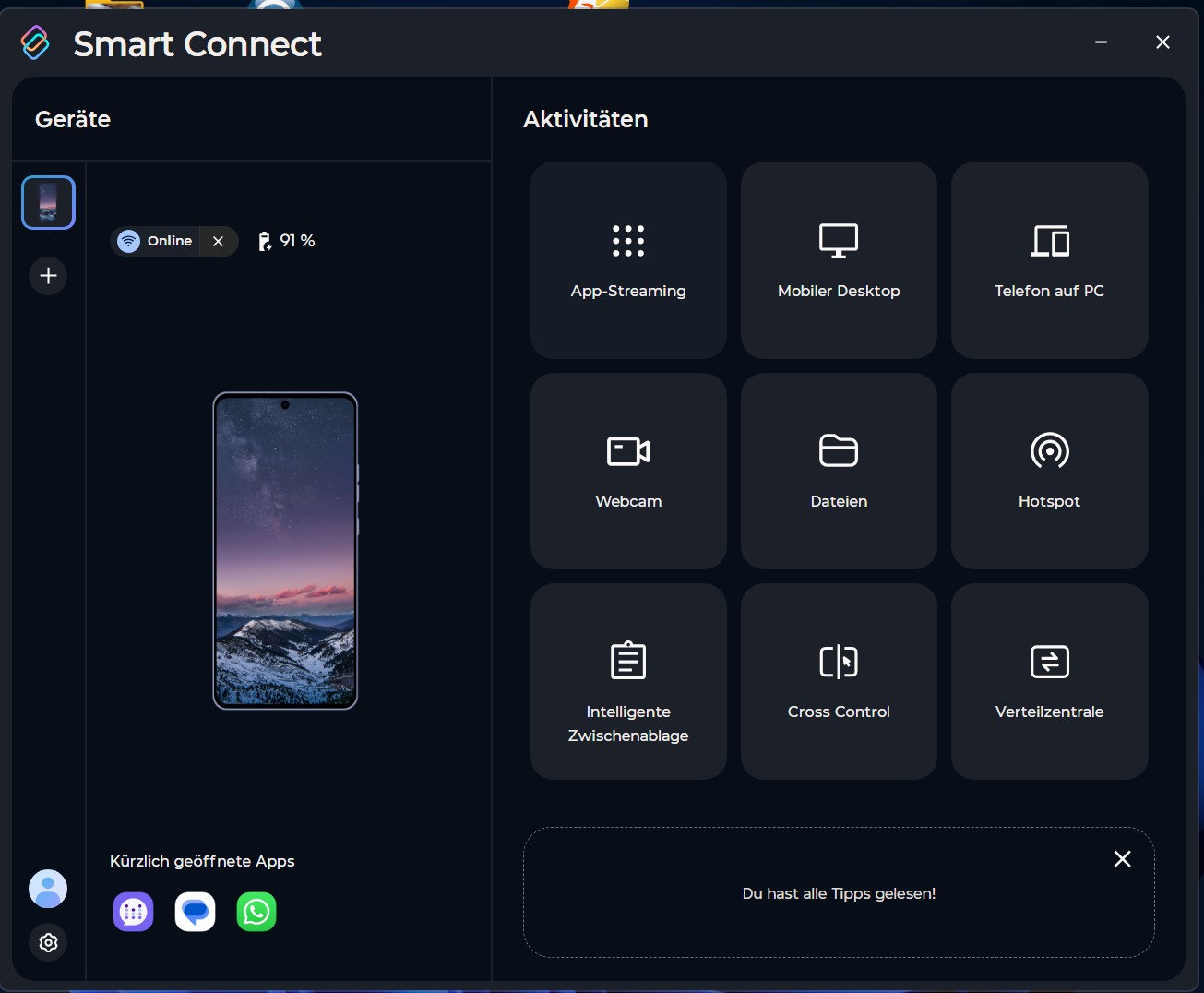 Mit Smart Connect hat man viele Zusatzfunktionen. Vom virtuellen Desktop, über App Streaming, bis hin zur Ablage via WLAN oder Kabel. Auch Cross Control gibt es, wo man bei verbundenem Smartphone Maus und Tastatur nahtlos vom PC rüberschieben und dann auf dem Smartphone nutzen kann - ohne zusätzliche Koppelung. Das Phone als Webcam nutzen geht natürlich auch und über eine Verteilzentrale kann man per Drag & Drop Dateien aufs Phone schieben und umgekehrt.