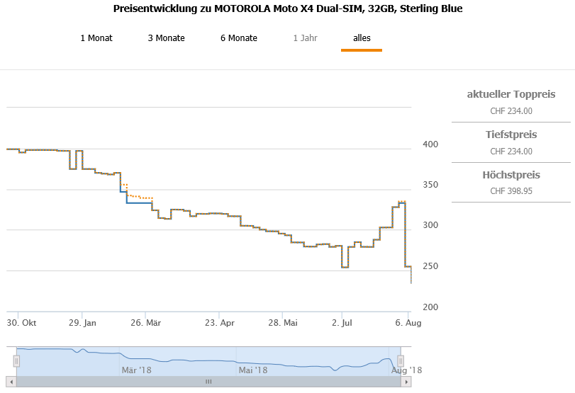 Digitec hat den Preis für das MOTOROLA Moto X4 Dual-SIM mit 32GB in Sterling Blue auf 234.- CHF reduziert.