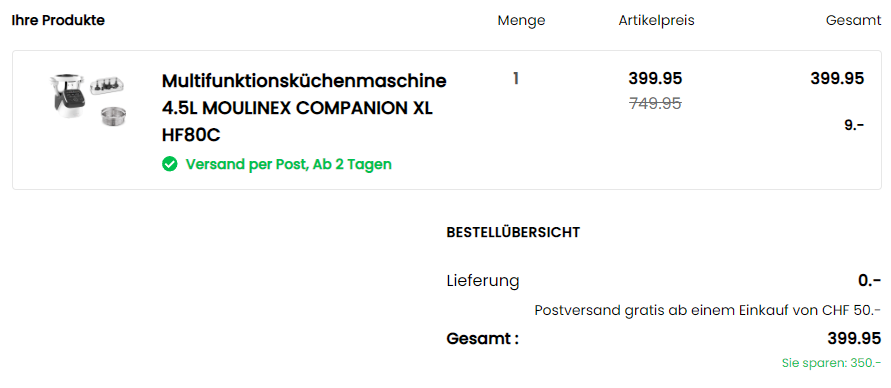 Bei Conforama könnt ihr euch derzeit die Küchenmaschine Moulinex Companion HF80C zum Aktionspreis für knapp 400 Franken sichern. Laut Recherche starten die Vergleichspreise sonst bei 479 Franken.