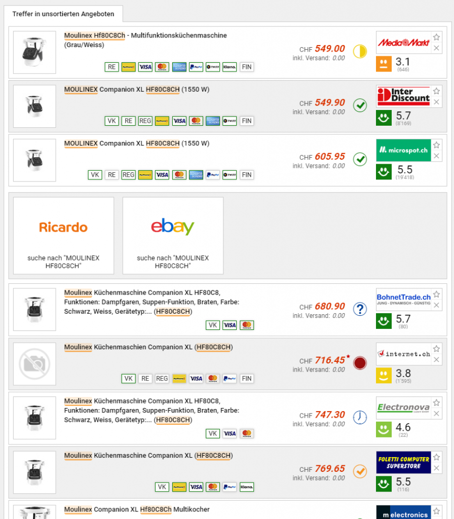 Bei Mediamarkt und Interdiscount gibts derzeit die Multifunktionsküchenmaschine MOULINEX HF80C8CH zum Aktionspreis von knapp 550 Franken. Laut toppreise liegen die Vergleichspreise sonst bei über 605 Franken.