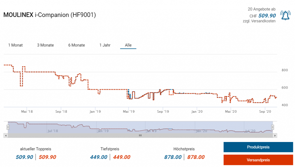 Bei nettoshop gibts derzeit die Küchenmaschine i-Companion HF9001 von Moulinex zum Aktionspreis von 399 Franken. Mit dem passenden Bon spart man nochmal 20 Franken. Laut toppreise liegt der Vergleichspreis bei knapp 510 Franken, zudem solls das Gerät nie unter 449 Franken gegeben haben.