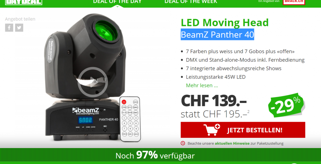 Der Moving Head Panther gibt es heute bei DayDeal für CHF 139.-. Vor mehreren Monaten gab es einmal einen Tiefpreis von CHF 129.-. Der zweitbeste Preis beträgt CHF 180.30.