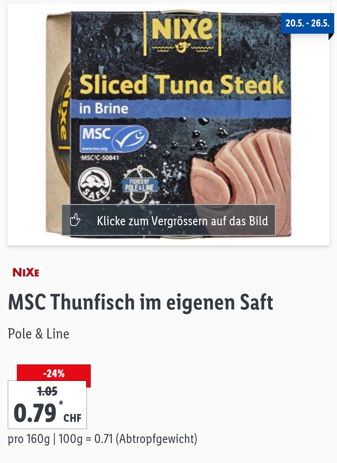 Bis am 26.05. gibts bei Lidl den MSC Thunfisch in eigenem Saft für CHF 0.79. lidl rundet die Preise immer zu Gunsten der Kunden an der Kasse ab. Also wohl CHF 0.75 wenn nur 1 Dose gekauft würde. Aber mal ehrlich - bei diesem Preis? 😀