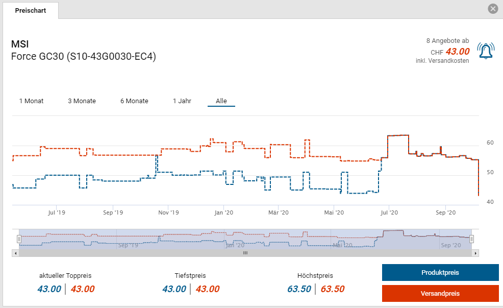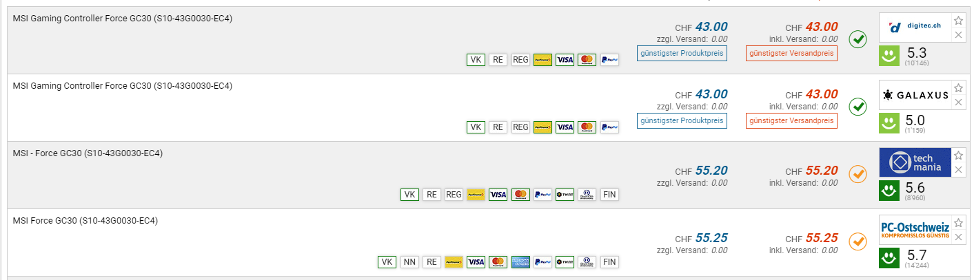 Bei Digitec und dem Partner Galaxus gibt es den MSI Force GC30 Controller für den neuen Bestpreis von CHF 43.-. Der vorherige Bestpreis war CHF 54.80. Der zweitbeste Preis beträgt CHF 55.20.
