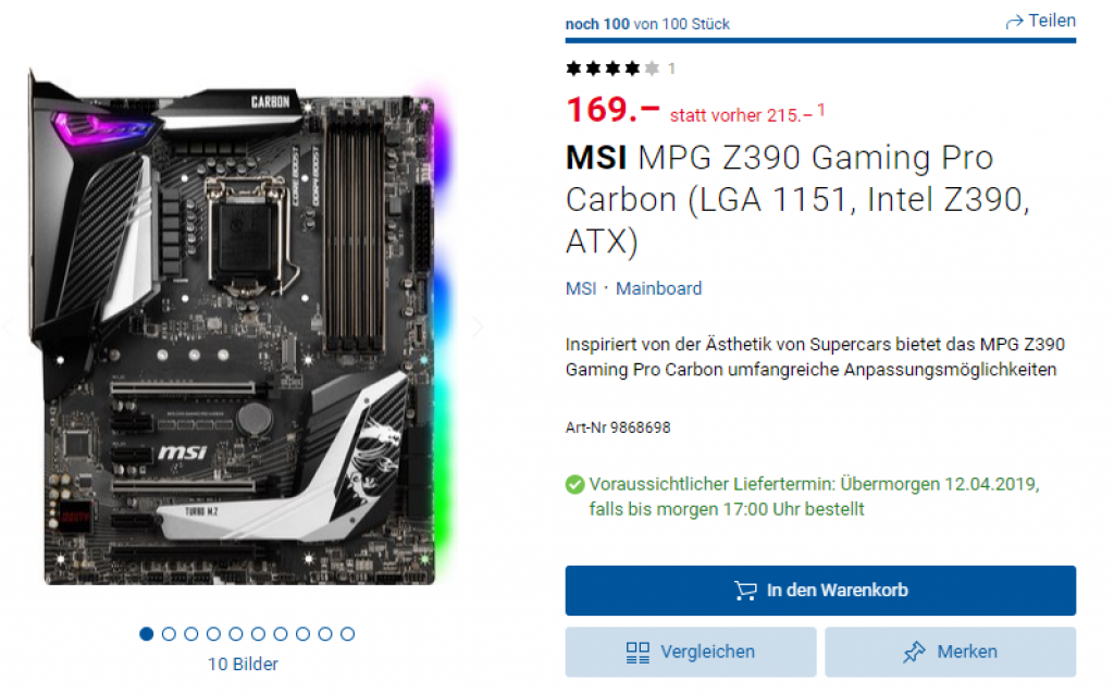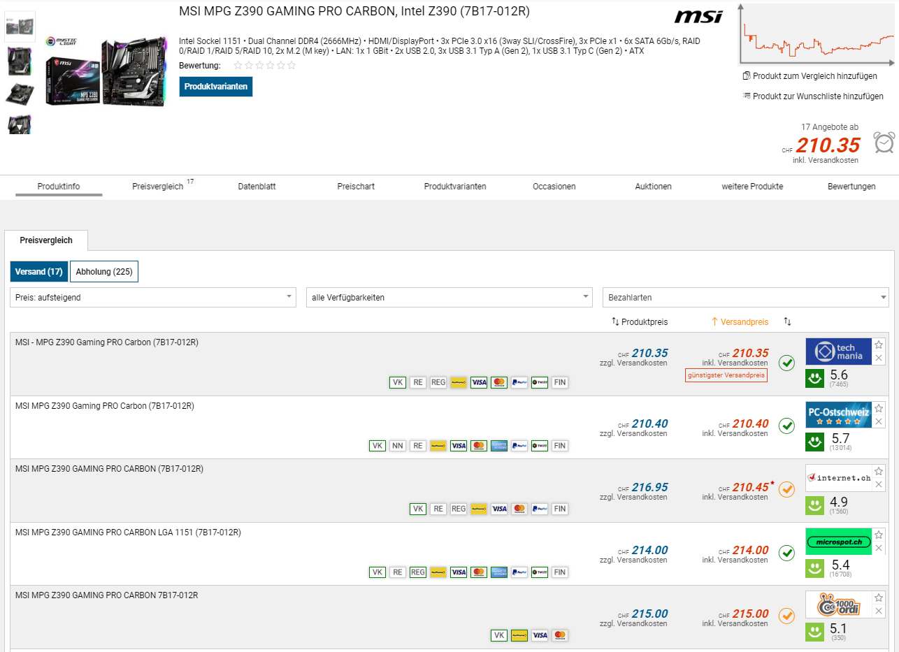 Bei digitec gibt es jetzt das MSI Z390 Mainboard für CHF 169.- statt 215.-. Tiefstpreis laut Toppreise war 197.-